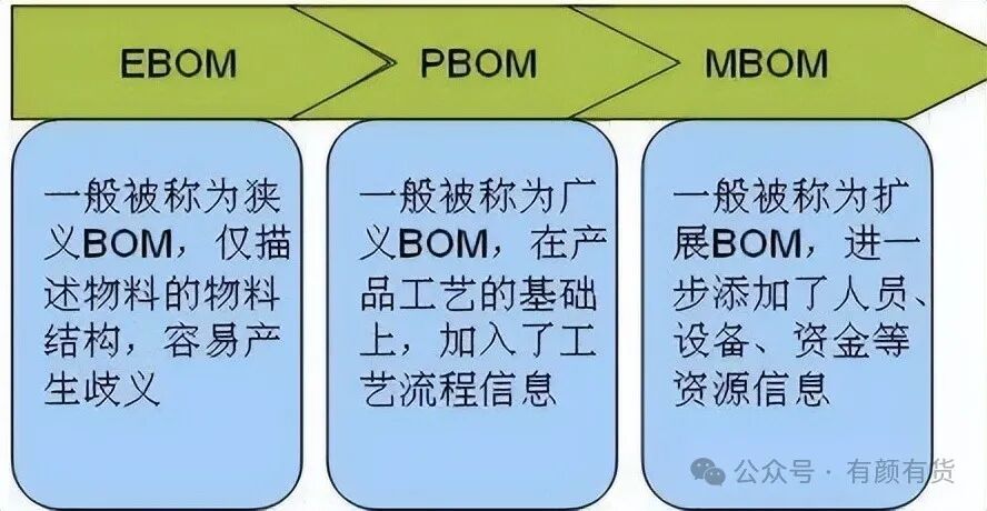 EBOM 设计BOM - Engineering BOM 主要是设计部门产生的数据,产品设计人员根据客户订单或者设计要求进行产品设计,生成包括产品名称、产品结构、明细表、汇总表、产品使用说明书、装箱清单等信息,这些信息大部分包括在EBOM中。EBOM是工艺、制造等后续部门的其它应用系统所需产品数据的基础。 一般由产品设计部门根据产品装配系统图以及产品零部件明细表等产生,用以描述产品设计结构。其中产品装配系统图阐明组成产品的零部件之间的设计装配关系,产品零部件明细表具体说明零部件的种类,如通用件、标准件、自制件、外购件和外协件等。EBOM 是工艺、制造等其他应用系统所需产品数据的基础,常见的文本表现形式包括产品明细表、图样目录和材料定额明细表等。 PBOM 工艺BOM - Process Planning BOM 是工艺设计部门以EBOM中的数据为依据,制定工艺计划、工序信息、生成计划BOM的数据。计划BOM是由普通物料清单组成的,只用于产品的预测,尤其用于预测不同的产品组合而成的产品系列,有时是为了市场销售的需要,有时是为了简化预测计划从而简化了主生产计划。 由工艺设计部门在 EBOM 的基础上,对产品结构进行工艺分解,建立装配件的装配工艺和各零件的制造工艺,并确定加工制造过程中应使用的工装和模具。PPBOM 是根据工厂的加工水平和能力对EBOM 再设计后生成的,使用可以明确地了解零件之间的制造关系,跟踪零件在何处制造、由谁制造、用什么制造等信息,其常见的文本表现形式为产品工艺分单位目录等。 MBOM 制造BOM - Manufacturing BOM 是制造部门根据己经生成的PBOM,对工艺装配步骤进行详细设计后得到的,主要描述了产品的装配顺序、工时定额、材料定额以及相关的设备、刀具、卡具和模具等工装信息。 制造工程部门在PPBOM基础上增加了物料项的工艺流程 (制造和装配工艺)、工装资源、原材料和半成品等信息形成,反映了零件、装配件和最终产品的制造方法和装配顺序,如制造、装配工序内容及相应的加工设备、工装夹具、刀具辅具等。 它详细描述了产品的制造过程,是企业资源规划( Enterp rise RosoureP lann ing,ERP )运算的输入信息。该BOM常见的文本表现形式为工艺路线表、关键工序汇总表、重要件关键件明细表、自制件明细表、通用件明细表、通用专用工装明细表和设备明细表等。