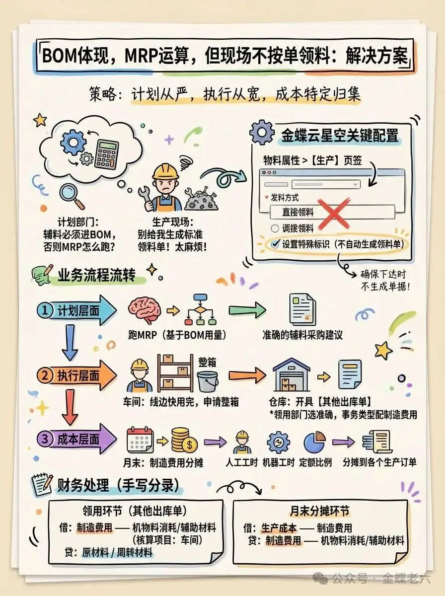 B:设置辅料不发料,并且通过其他出库单进行处理有些企业会针对辅料设置BOM,但是实际管理并不直接发料,而且通过其他出库单进行领用,但是会通过MRP去计算BOM中辅料的使用去下计划,可以针对辅料设置不发料,但是通过其他出库单进行领料,后面再进行一个辅料的成本归集和分配。 以上属于典型的“计划与执行分离”模式。这在很多半离散、半流程的制造企业里特别常见。 BOM中有体现,MRP运算需求,但现场不按单领料。 BOM设置:辅料在BOM中必须维护准确的单耗(包含合理的损耗率)。这是为了满足MRP计算采购需求的前提。 发料控制:针对这一块的辅料不发料的物料在物料层次直接设置不发料控制。