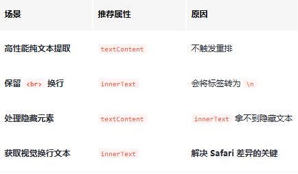 在某些特定版本的 Safari 渲染引擎中,它对 textContent 的实现非常遵循“源码原始性”。如果文本是因为容器宽度挤压产生的软换行(Soft Wrap),Safari 的 textContent 绝对不会帮你补上那个 \n。