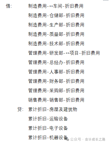 应交税费_应交增值税_待认证进项税额 贷:应付账款_明细应付款_**供应商 4、房租、水费(污水处理费/消防水费/水费)、电费按各部门实际用电量(电表分开,可取数) / 用水量(水表分开,可取数) 或使用面积分摊。 某部门应分摊水电费、租金= 水电费、租金总额 ×(该部门面积 ÷ 全部总面积) 借:制造费用-**车间或部-水电费/租金等 应交税费_应交增值税_待认证进项税额 贷:银行存款-**银行 5、折旧计提