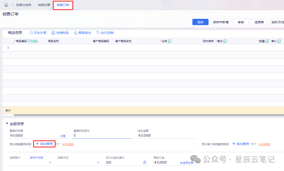 【问题描述】销售出库产生的费用,如何处理?【业务场景】销售出库过程产生的费用,如运费、搬运费等,如何处理?销售业务后期或者跨期产生的费用如何处理?【操作步骤】方式一、销售类单据上录入(适用业务发生的同时能确认费用的场景)1、如果有销售订单环节,支持在订单上录入预计销售销售费用,销售出库时带入销售出库2、本次销售出库产生...