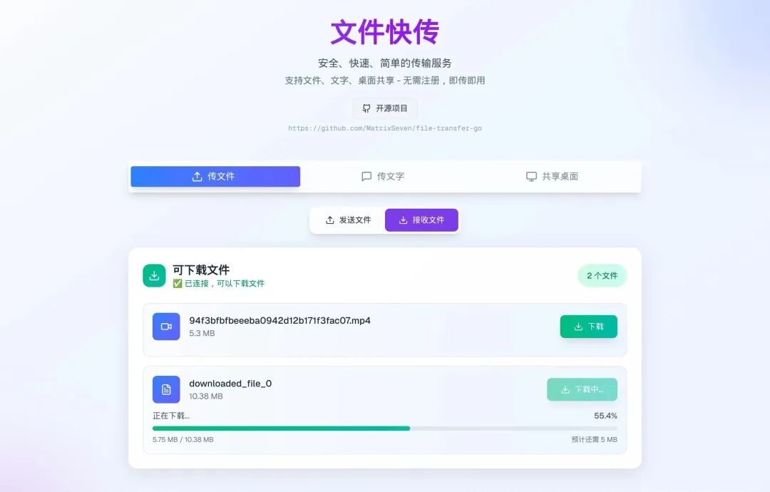 file-transfer-go:没有服务器的文件传输file-transfer-go是一个基于Go和React开发的端到端WebRTC文件传输系统,支持文件、文字和桌面共享,所有数据通过P2P直连传输,不经过服务器,保障隐私安全。项目源码和下载地址如下:https://github.com/MatrixSeven/f...