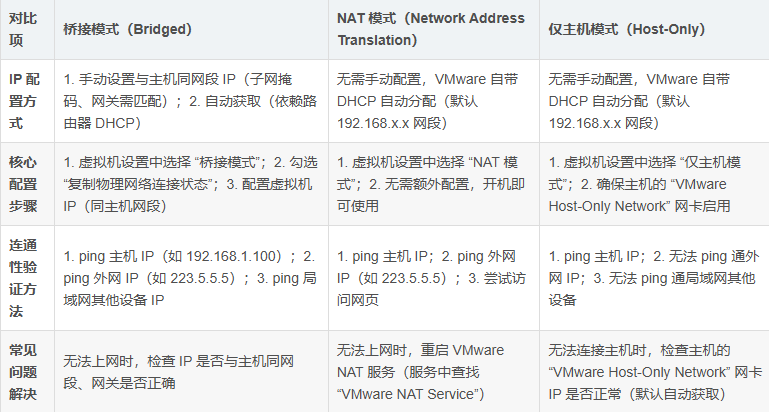 前言:VMware三种核心网络模式分别是桥接模式、NAT模式、仅主机模式,核心差异在于虚拟机与主机、外部网络的连通性。