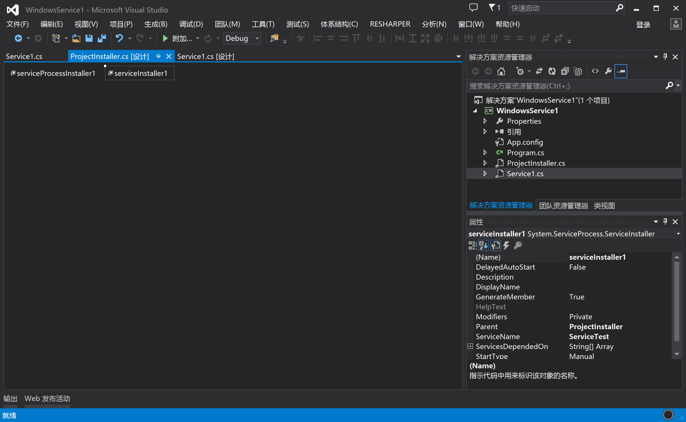 选中serviceInstaller1组件,查看属性