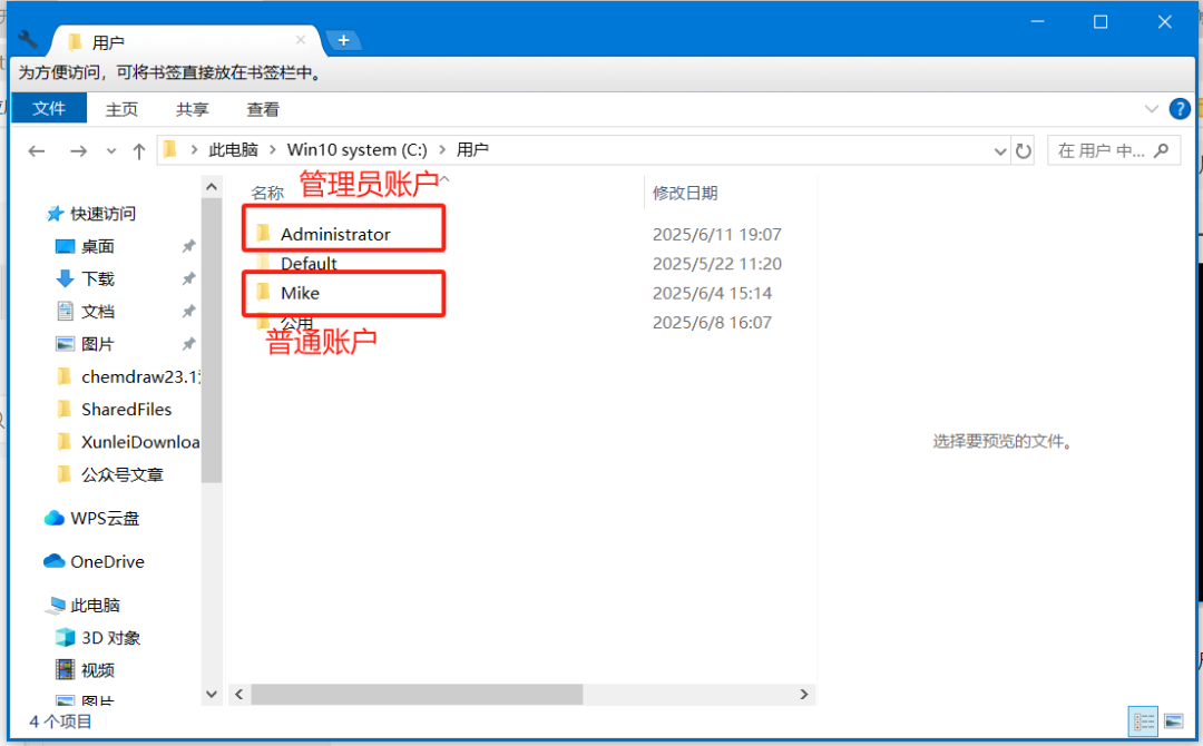 接下来在登录界面就能登录Administrator管理员账户,再打开C盘用户文件夹,就可以看到普通账户和Administrator账户文件夹。如果你要在管理员账户下打开之前账户的文件,那么点击进入普通账户,找到桌面/下载/文档等文件夹里面的相关相关文件打开:
