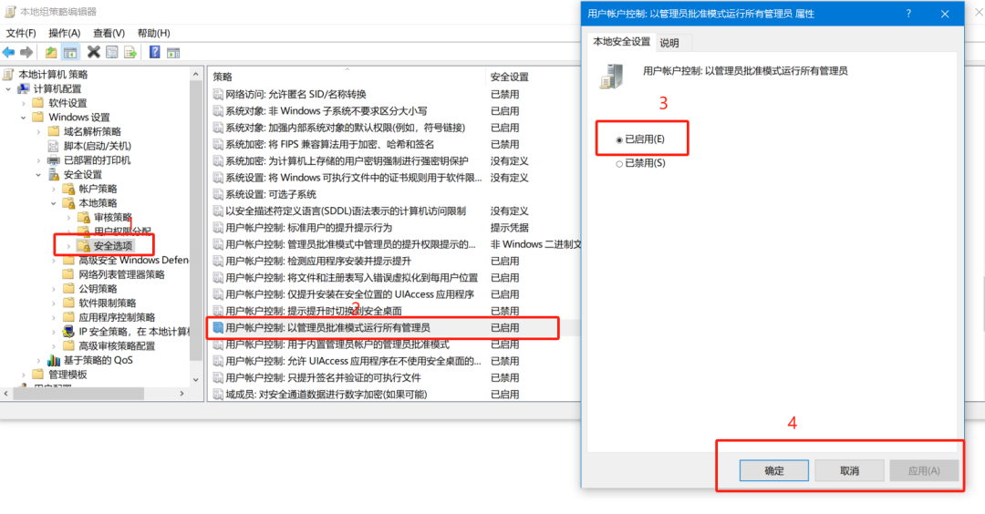 3.进入以下路径:计算机配置->Windows设置->安全设置->本地策略->安全选项->用户账户控制:以管理员批准模式运行所有管理员,双击打开,勾选已启用,然后右下角点应用-确定: