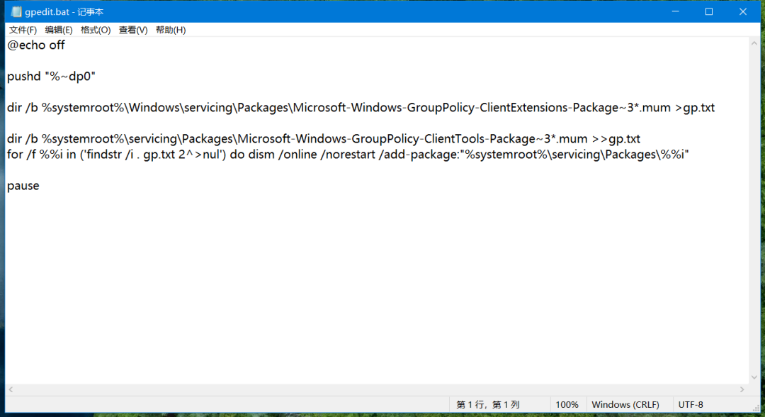 5.左上角点文件-保存为gpedit.bat批处理文件,然后右键以管理员运行,等待批处理执行完毕就可以正常使用gpedit.msc命令打开本地组策略编辑器。