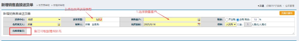 2.进入界面之后,按图操作:点击选择销售客户,然后再点击选择送货类型