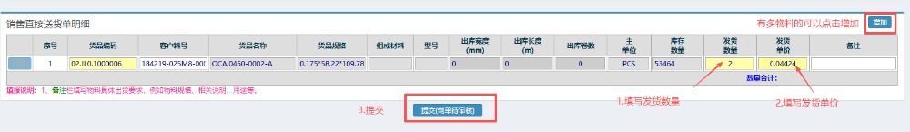 4.选好物料后,按图操作:填写好发货数量发货单价,有多物料需求的可以增加,没有就无视。最后提交审核
