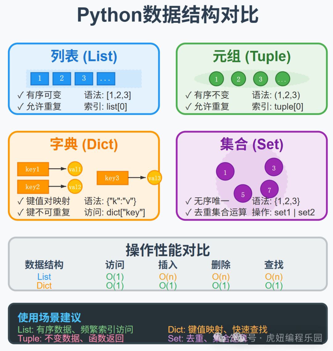 你是不是曾经想学编程,但一看到密密麻麻的代码就头皮发麻?🤯 相信我,我完全懂这种感觉。但其实,选对语言真的很重要——而Python,绝对是入门编程最友好的选择! 今天我就用最白话的方式,带你图解Python基础语法,保证你看得懂、学得会! 为什么Python这么受欢迎? Python的创始人吉多·范罗苏姆在1989年创造了这门语言,没想到如今它能火遍全球!它的设计理念就一句话:代码要写得像读英文一样简单。 这么说吧,如果用其他编程语言写程序需要10行代码,用Python可能只需要3-4行。就像你用手机快捷键一样,一键搞定复杂操作! Python还能跨平台使用,无论是在Windows、Mac还是Linux上都能运行。更重要的是,它有超多的现成工具库(标准库),让你不用从头造轮子。想要处理数据?画个图表?做网站?通通有现成的解决方案! 对了,Python的社区特别活跃,这意味着你遇到问题时,总能找到人帮忙。从Web开发到数据分析,从人工智能到自动化办公,Python几乎无处不在。 变量:数据的“容器” 想象一下,变量就像你家里的收纳盒,你可以往里面放东西,并给每个盒子贴个标签。 在Python中,你不需要事先声明这个盒子要放什么类型的东西,直接放就行——Python会自动识别。 比如: 取变量名有几个规矩:不能以数字开头,只能包含字母、数字和下划线,大小写是不同的,还有不能用Python的保留关键字(比如不能直接叫“print”)。 数据类型:东西分门别类 ![]() 就像超市里商品要分类摆放一样,数据也分不同类型: