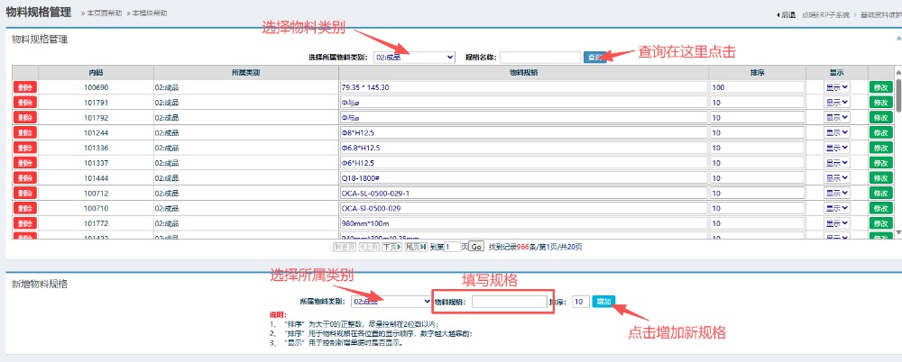 下方是新增规格的,也是同样选择物料类别,填写具体规格,然后点击增加