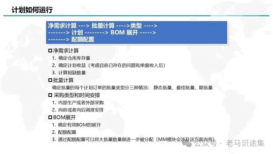 MRP运算还真是个挺复杂的计算过程,应该是ERP里最最复杂的计算过程之一,主要分为5个步骤,分别是:1净需求计算->2批量计算->3获取采购类型->4时间排程->5BOM展开。详细内容如下: