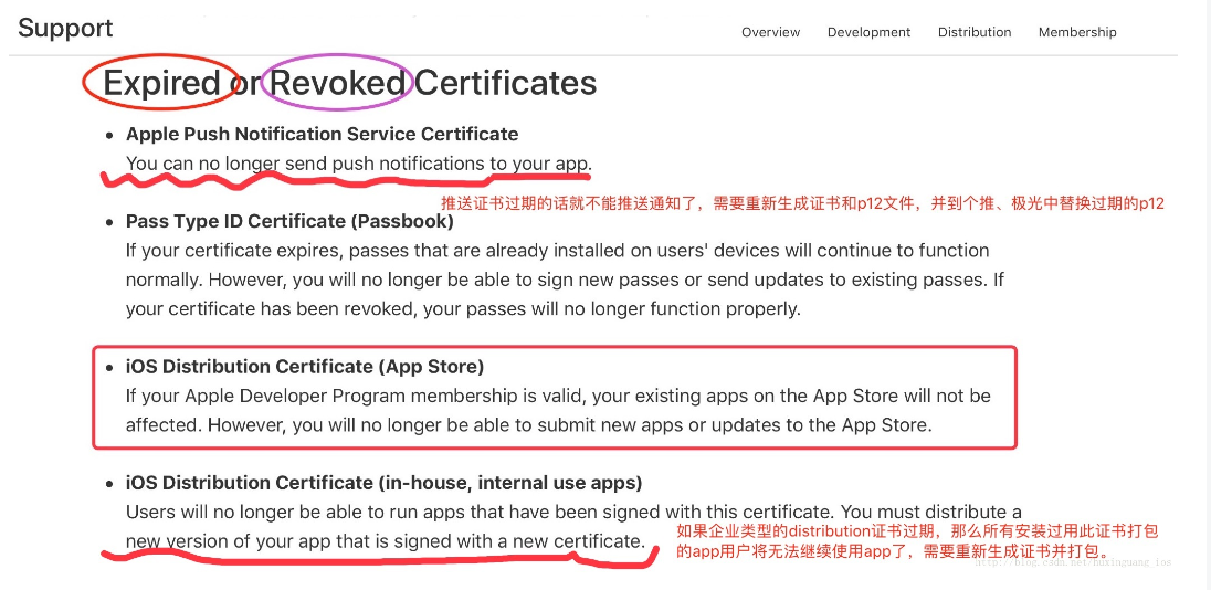 虽然distribution过期(或者被手动revoke)了,如果你的开发者账号是company(公司)类型或个人类型的,只要你的每年99$的开发者membership没有过期,就不会对已上架的app产生影响,只是你下次发布或者更新app就要重新生成一个distribution证书了。如果你的开发者账号是enterprise类型(企业级)的,证书过期或被revoke了之后,那么安装过该证书打包的app的用户将无法打开该app了,这就需要开发人员重新生成证书再打包一个app了。