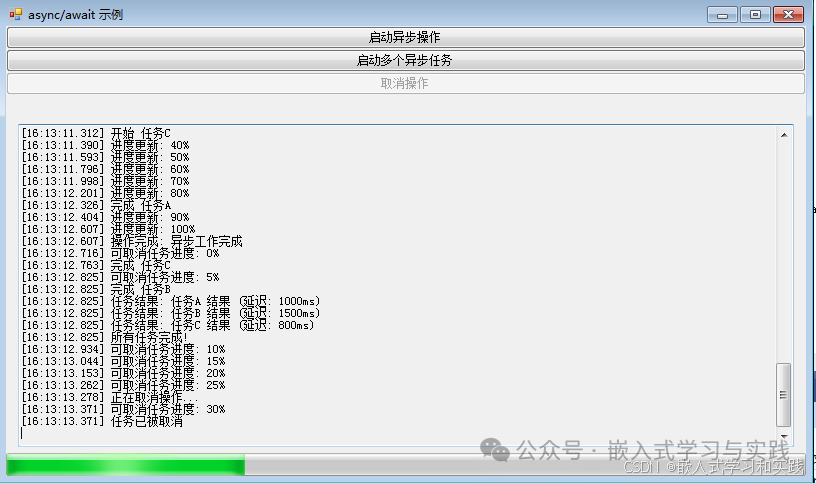private async  void btnStartMultiple_Click(object sender, EventArgs e)        {            LogMessage("开始多个异步任务...");            btnStartMultiple.Enabled = false;            try            {                // 同时启动多个异步任务                var task1 = DoAsyncWorkWithName("任务A"1000);                var task2 = DoAsyncWorkWithName("任务B"1500);                var task3 = DoAsyncWorkWithName("任务C"800);                // 等待所有任务完成                string[] results = await Task.WhenAll(task1, task2, task3);                foreach (string result in results)                {                    LogMessage($"任务结果: {result}");                }                LogMessage("所有任务完成!");            }            catch (Exception ex)            {                LogMessage($"任务出错: {ex.Message}");            }            finally            {                btnStartMultiple.Enabled = true;            }        }        // 异步工作方法 - 使用 IProgress 报告进度        private async Task<stringDoAsyncWork(IProgress<int> progress)        {            return await Task.Run(() =>            {                for (int i = 0; i <= 100; i += 10)                {                    // 检查取消请求                    if (cancellationTokenSource?.Token.IsCancellationRequested == true)                    {                        throw new OperationCanceledException();                    }                    // 模拟工作                    System.Threading.Thread.Sleep(200);                    // 报告进度,更新UI                    progress?.Report(i);                }                return "异步工作完成";            });        }        // 带名称的异步工作        private async Task<stringDoAsyncWorkWithName(string taskName, int delay)        {            LogMessage($"开始 {taskName}");            await Task.Run(() =>            {                // 模拟工作                System.Threading.Thread.Sleep(delay);            });            LogMessage($"完成 {taskName}");            return $"{taskName} 结果 (延迟: {delay}ms)";        }        // 带取消支持的异步工作        private async Task StartCancellableWork()        {            cancellationTokenSource = new System.Threading.CancellationTokenSource();            btnCancelOperation.Enabled = true;            try            {                var progress = new Progress<int>(percent =>                {                    progressBar.Value = percent;                    LogMessage($"可取消任务进度: {percent}%");                });                string result = await DoCancellableWorkAsync(progress, cancellationTokenSource.Token);                LogMessage($"可取消任务完成: {result}");            }            catch (OperationCanceledException)            {                LogMessage("任务已被取消");            }            finally            {                btnCancelOperation.Enabled = false;                cancellationTokenSource = null;            }        }        private async Task<stringDoCancellableWorkAsync(IProgress<int> progress, System.Threading.CancellationToken cancellationToken)        {            return await Task.Run(() =>            {                for (int i = 0; i <= 100; i += 5)                {                    // 检查取消令牌                    cancellationToken.ThrowIfCancellationRequested();                    // 模拟工作                    System.Threading.Thread.Sleep(100);                    // 报告进度                    progress?.Report(i);                }                return "可取消任务完成";            }, cancellationToken);        }        private void btnCancelOperation_Click(object sender, EventArgs e)        {            if (cancellationTokenSource != null)            {                cancellationTokenSource.Cancel();                btnCancelOperation.Enabled = false;                LogMessage("正在取消操作...");            }        }    }}