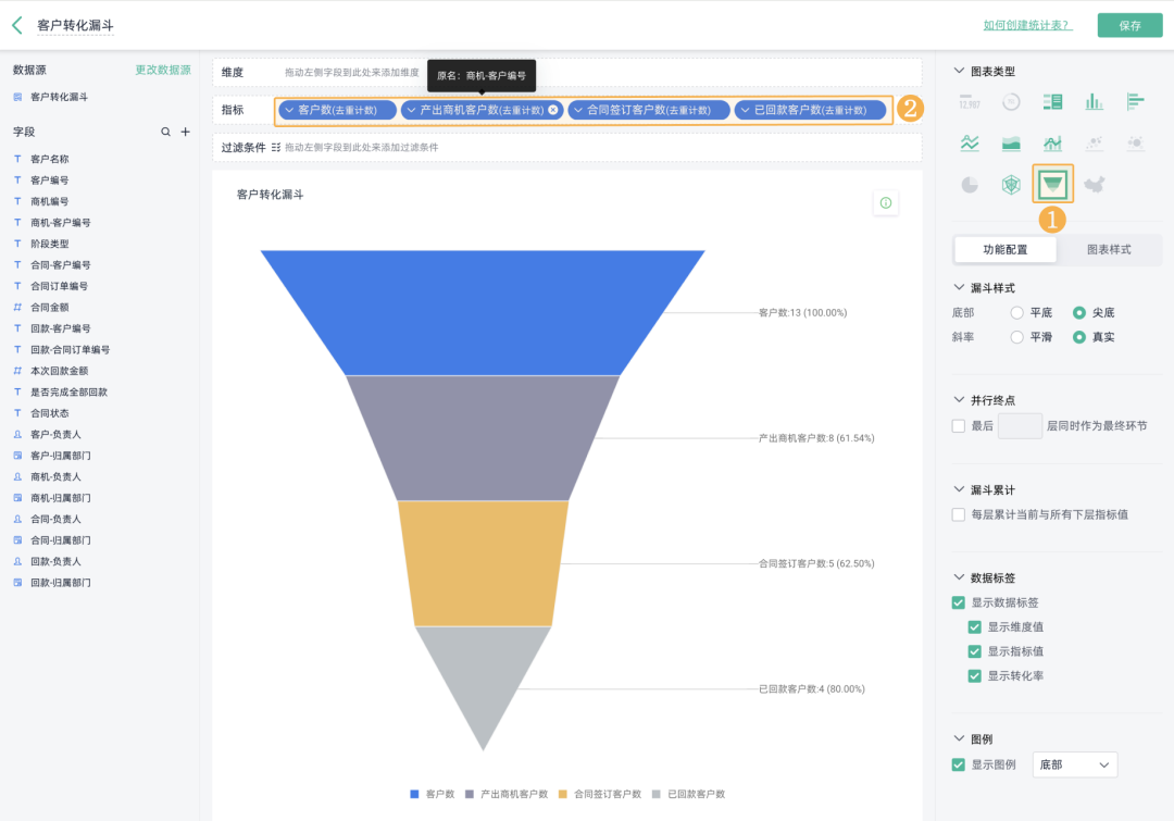 数据要看得见。 漏斗图能帮你一眼看到每个阶段的客户量、转化率。