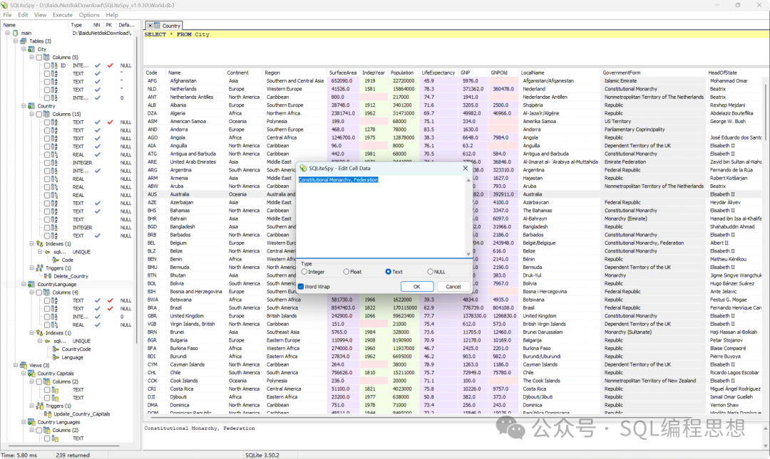 SQLiteSpy 具有简洁、快速和程序员友好等特点,适合频繁执行 SQL 查询和快速数据编辑的开发者。