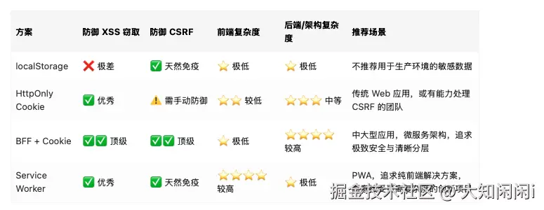 如果应用规模较小且暂时无法引入 BFF,HttpOnly Cookie 配合严格的 SameSite 策略和 CSRF Token,依然是比 localStorage 安全得多的可靠选择。